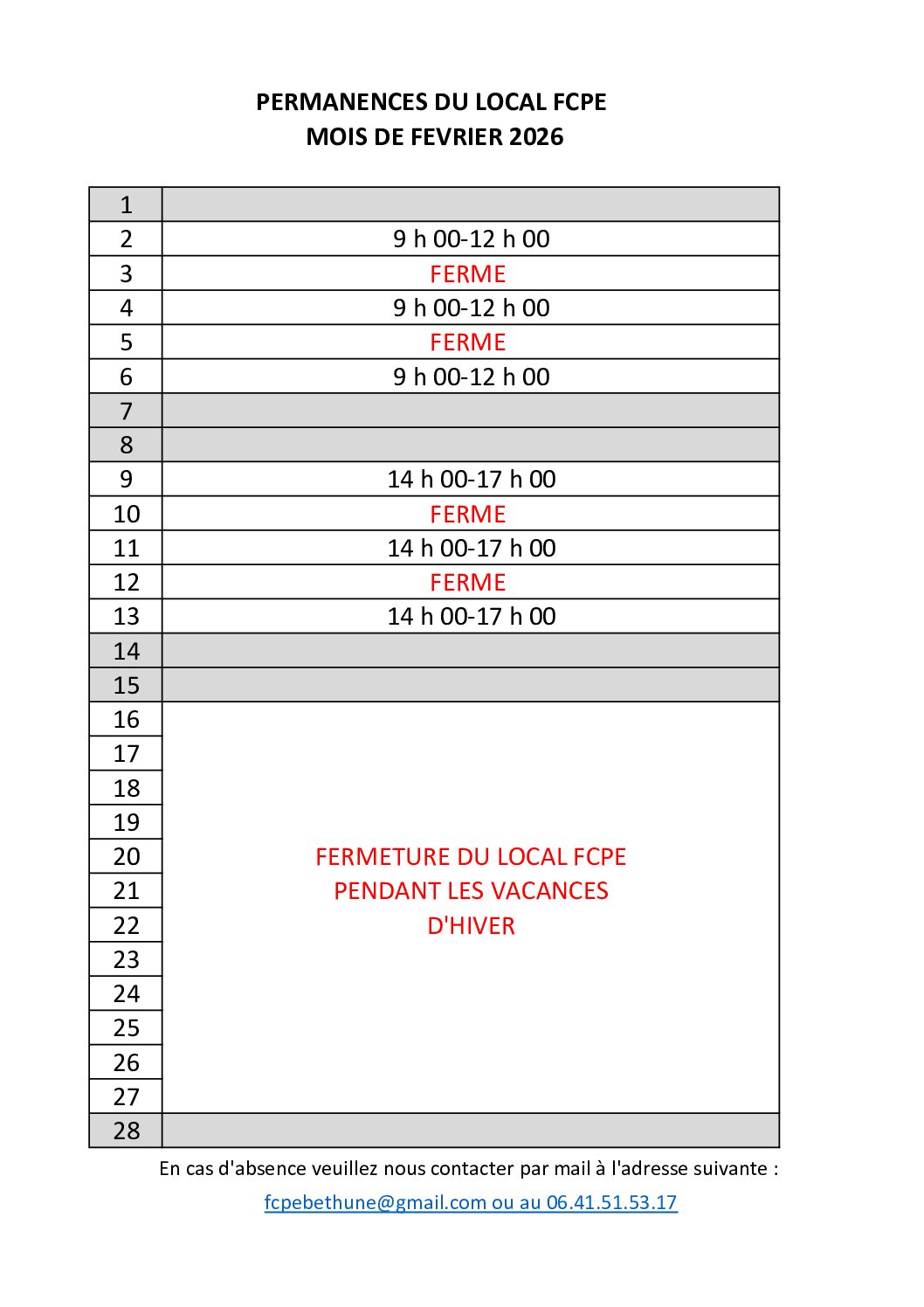 Permanences FCPE Février 2026